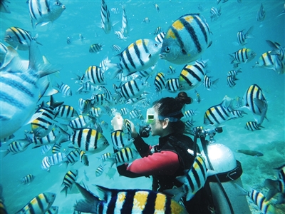 游客在蜈支洲島旅游區潛水。 三亞日報記者 陳聰聰 通訊員 陳文欣 攝