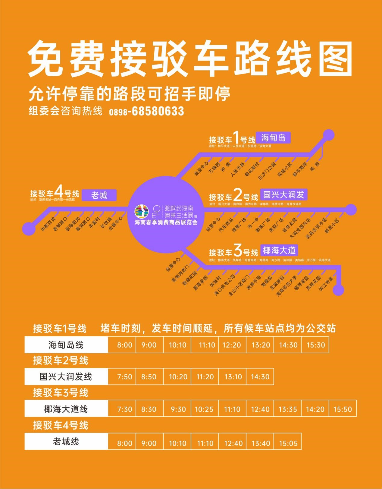 2021年3月17日—21日展會期間,展會組委會除了在展館規劃足夠停車位以外,還特別提供從海南國際會展中心往返海口市區及澄邁的免費接駁服務,具體包括海甸島線、國興大潤發線、椰海大道線、老城線,以方便消費者出行。