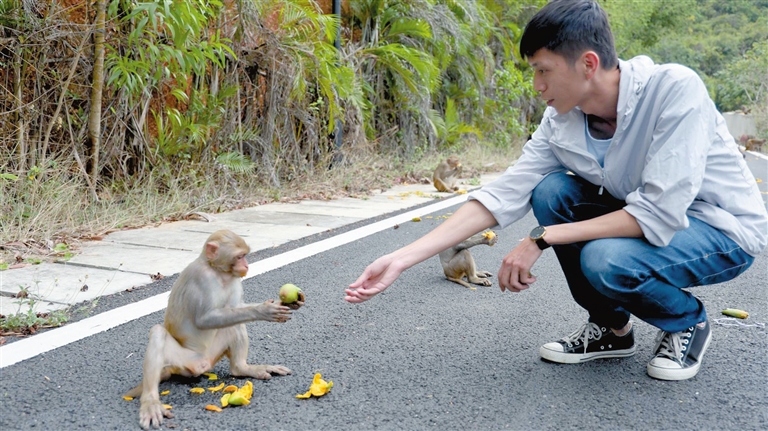 為探尋鹿回頭景區(qū)生態(tài)開發(fā)、綠色發(fā)展之道,近日,記者來到鹿回頭景區(qū),在山頂上遠(yuǎn)眺起伏的山巒,景色極為壯觀,在茂密的森林中,偶見幾只野生獼猴快速晃過的身影。據(jù)介紹,野生獼猴屬于國家二級(jí)保護(hù)動(dòng)物,鹿回頭是目前三亞市區(qū)特有野生獼猴群落棲息的景區(qū),現(xiàn)有20余群約300余只野生獼猴,猴群喜食野果,常在清晨與傍晚出沒林間和景區(qū),與游客們互動(dòng)嬉戲。“我從來沒有見過獼猴,今天是第一回見,它們?cè)跇渖鲜巵硎幦ィ苡腥ぁ!眮碜陨轿鞯耐跸壬嬖V記者。