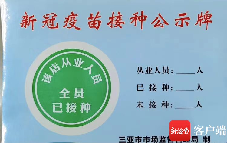 三亞市市場監(jiān)督管理局全面啟動了重點行業(yè)經(jīng)營單位新冠疫苗接種公示工作,通過發(fā)放“新冠疫苗接種公示牌”及“紅黃綠”圖標(biāo),對旅游購物店、海鮮廣場、餐飲店、食品銷售店、冷鏈?zhǔn)称芳庸ぜ颁N售業(yè)等重點行業(yè)疫苗接種情況進(jìn)行公示管理。市民游客及時了解各經(jīng)營單位的疫苗接種情況,安心進(jìn)入各消費場所。