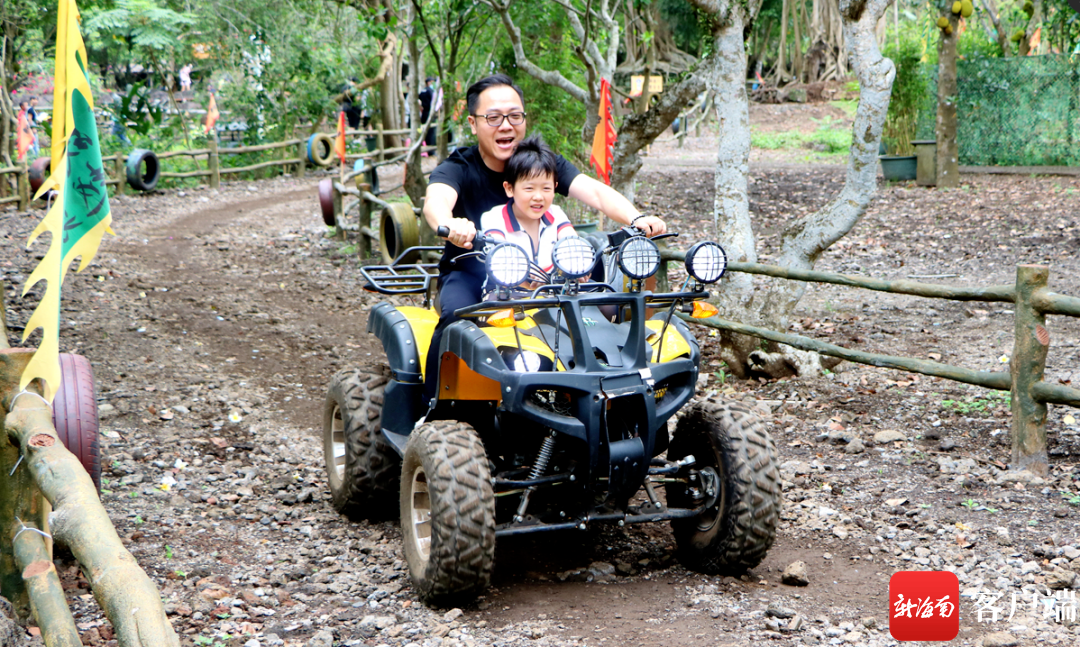 城市火山上,綠樹成蔭,游客們在火山石山路中穿越雨林,觀賞熱帶植被,看萬年熔巖流淌過的痕跡。當天,前來登山的游客也絡繹不絕。在野戰基地,一聲聲尖叫此起彼伏,游客們穿上颯爽軍裝,端起槍支,穿梭在叢林中展現各種隊形陣勢,投入到扮演士兵和將領的角色中。“沒想到火山口還有這種娛樂項目,讓孩子玩得很開心?!眮碜越鞯挠慰屠钏粗约旱暮⒆釉趨擦种写┧蟆?/span>