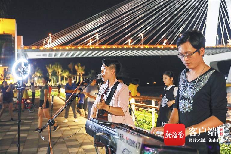 傍晚,一抹抹晚霞在世紀大橋映襯下,"落"在??跒忱?,勾勒出令人陶醉的椰城美景,霓虹閃爍,酒館微醺,清吧里,吟游的歌者,步道上,打卡拍照的游人,還有街頭藝人的熱鬧喧囂。