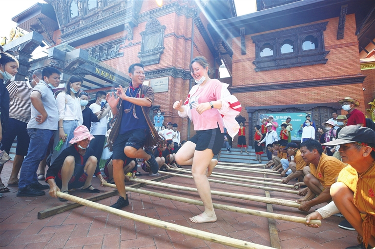5月4日,游客和民間藝人在三亞南山文化旅游區(qū)跳打柴舞,感受非遺文化。 三亞日報記者 袁永東 通訊員 陳文武 攝