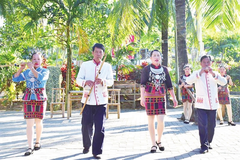 吉陽區(qū)中廖村黎家小院,穿著黎族服裝的村民演員在給游客表演黎族歌舞。 三亞日報記者 陳聰聰 攝