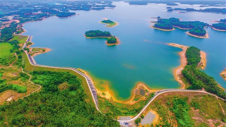 定安縣南麗湖,湖中島灣星羅棋布,宛如一幅美麗畫卷。張茂 攝