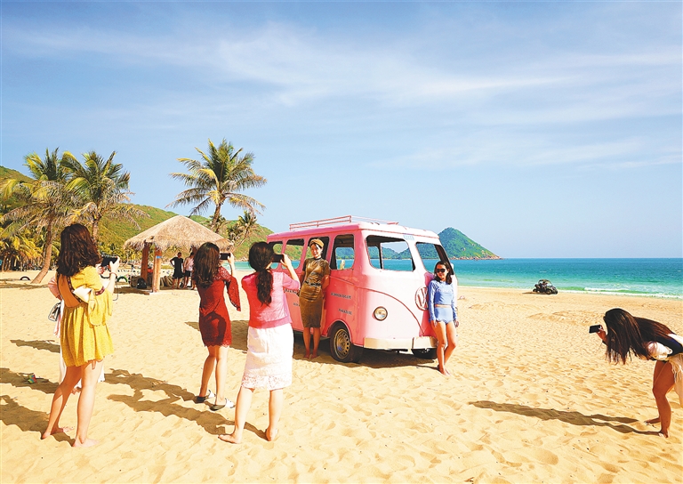 粉紅巴士、白色老爺車、七彩沙灘椅、泡泡屋、秋千……以藍天碧海和潔白沙灘為背景,清新文藝而又充滿萌感的道具散落其中,南灣猴島南側的呆呆島成為不少人前來打卡拍照的景點。在小紅書、微博和抖音等各大網絡平臺中,常??梢钥吹骄W友們風格清新的美照。每天限流500人,并不是所有團隊客都能上島。