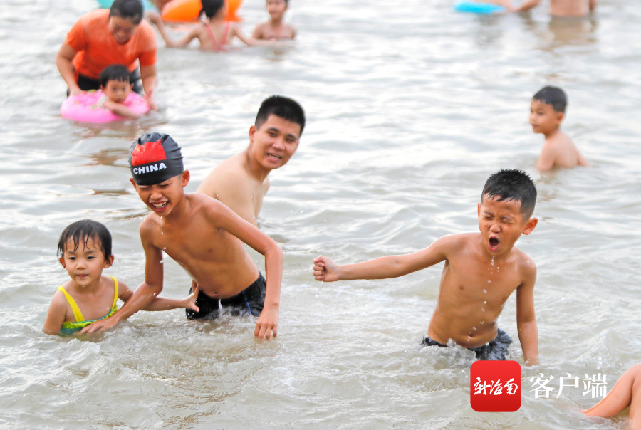 孩子們在假日海灘“洗龍水”。記者 汪承賢攝