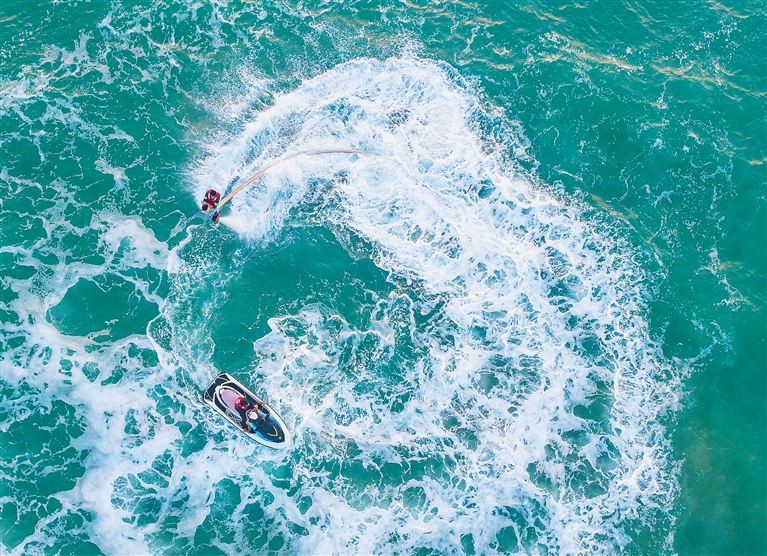 △樂東黎族自治縣龍沐灣海邊,市民游客在體驗水上項目。海南日報記者 宋國強 攝