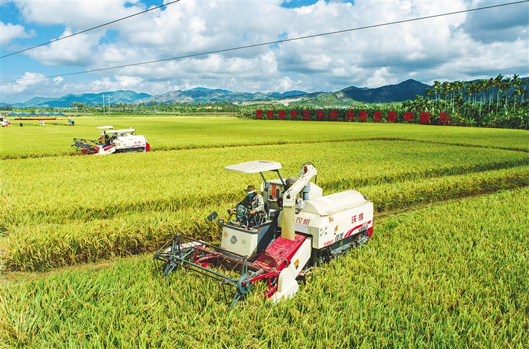 △在三亞市崖州區(qū)(壩頭)南繁公共試驗基地,聯(lián)合收割機在收割“超優(yōu)千號”雜交水稻。海南日報記者 武威 攝