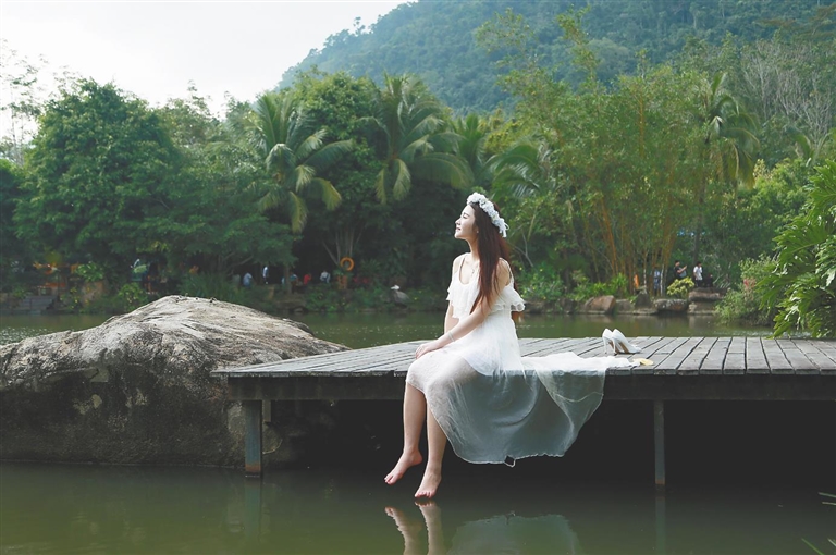 △在呀諾達熱帶雨林,游客享受飽含負(fù)氧離子的新鮮空氣。海南日報記者 武威 攝