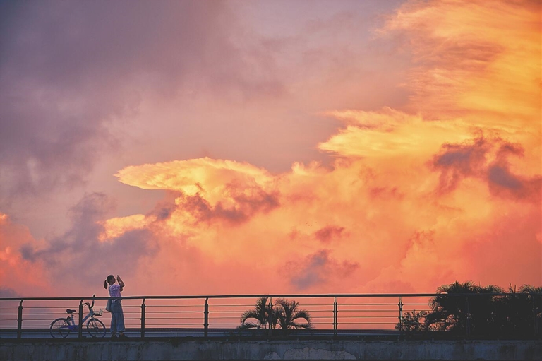 此時抬頭,總能看到大幅的垂天彩云,光影變幻間色彩流動。有時從云端激射出萬道紅光,火燒云氣勢磅礴,如火山巖漿從天際泄出;有時是一片浪漫的粉紅色鋪滿天空,引人無限遐想……這些是屬于海南盛夏的萬種風(fēng)情。