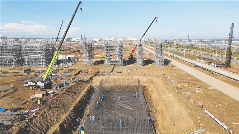 △洋浦經(jīng)濟開發(fā)區(qū)海南煉化百萬噸乙烯項目施工現(xiàn)場熱火朝天。項目竣工投產(chǎn)后將直接拉動超1000億元的下游產(chǎn)業(yè),助力海南自貿(mào)港建設(shè)。海南日報記者 陳元才 攝