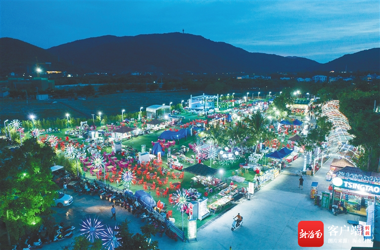 說(shuō)話間,一輛輛小推車發(fā)出哐哐當(dāng)當(dāng)?shù)穆曇粲蛇h(yuǎn)及近,越來(lái)越多的村民準(zhǔn)備營(yíng)業(yè)。夜幕降臨,博后夜市張燈結(jié)彩,人頭攢動(dòng),百余個(gè)攤位有序排開(kāi),傳統(tǒng)手工藝品、黎族特色織品等商品琳瑯滿目。三五成群的游客涌進(jìn)夜市,被應(yīng)季水果、海南小吃、海鮮燒烤等特色美食“俘獲”。