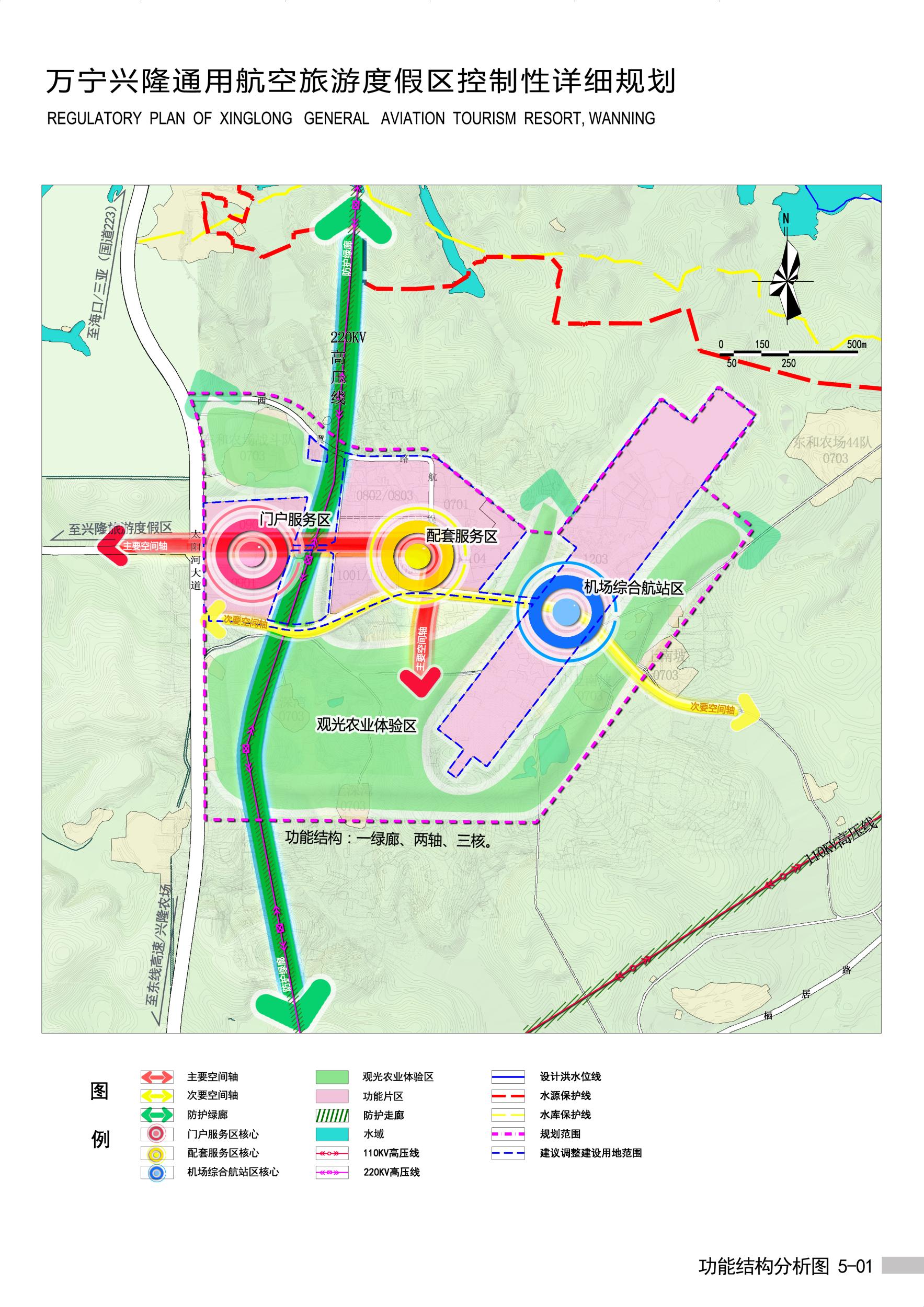 度假區將按照“一綠廊、兩軸、三核”的空間結構打造。“一綠廊”為220KV高壓線的防護綠廊。“兩軸”是以興航大道為軸,串聯門戶服務區和配套服務區的主要空間軸線;以美航路為軸,串聯配套服務區、機場綜合航站區的次要空間軸線。“三核”是以西部門戶服務區、中部配套服務區、東部機場綜合航站區為主的三大核心,是規劃區的主題區,由自然指狀的觀光農業體驗區串成景觀、視線、生態廊道。