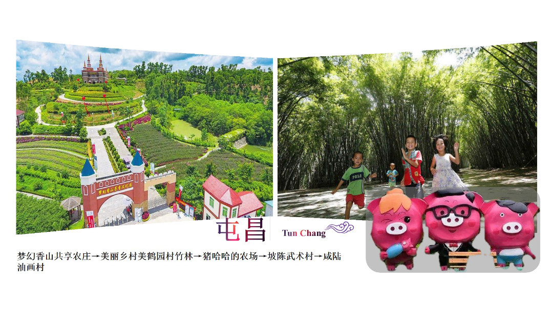 夢幻香山共享農莊→美麗鄉村美鶴園村竹林→豬哈哈的農場→坡陳武術村→咸陸油畫村