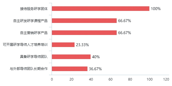 1、基本情況:絕大多數(shù)的研學(xué)機構(gòu)擁有接待研學(xué)團體活動的能力和經(jīng)驗,研學(xué)服務(wù)體系相對完善。其中76.92%的機構(gòu)自主開發(fā)研學(xué)課程,61.54%的機構(gòu)有基地運營能力。
