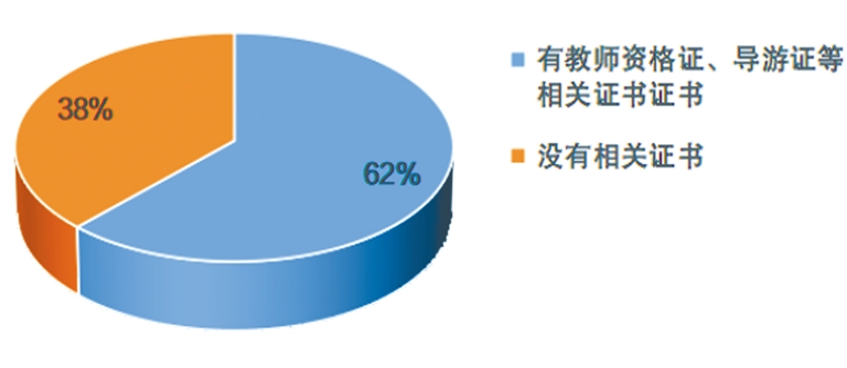 3.相關(guān)資質(zhì):基地、機構(gòu)內(nèi)的研學(xué)導(dǎo)師從業(yè)資質(zhì)情況較好,但是仍有1/3左右的沒有任何資格證。