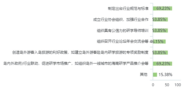 建議島內(nèi)相關(guān)部門出臺行業(yè)規(guī)范標(biāo)準(zhǔn),增加高水平培訓(xùn)項目,落實人才培養(yǎng)計劃,輔助研學(xué)機構(gòu)、基地擴充研學(xué)導(dǎo)師數(shù)量,提高團隊業(yè)務(wù)能力。