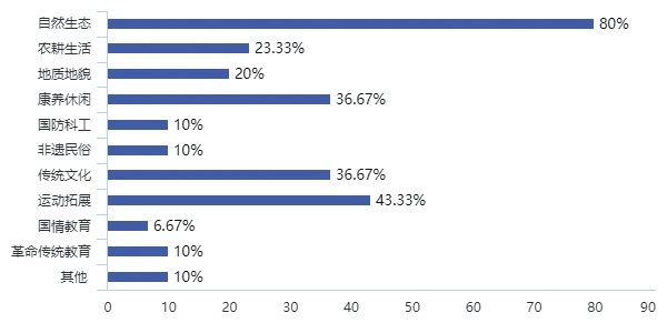 1.基本情況:基地近5年發(fā)展迅速。參調(diào)基地中80%以自然生態(tài)資源為依托,形成以自然教育為核心,其次帶有運動拓展、傳統(tǒng)文化、康養(yǎng)休閑等類型的主題課程。