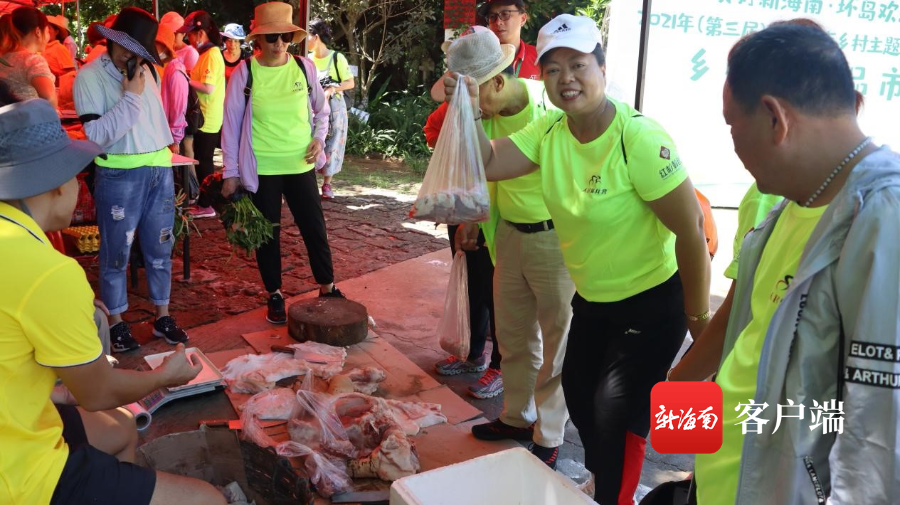 活動當天,還在五椰級鄉村旅游點頭洋·海堂舉辦了農產品市集。農戶陳朝南早上六點多鐘宰殺了自家養的兩頭生豬,并帶到現場售賣,吸引游客們紛紛前來詢問和購買,現場銷售一空。游客還向農戶們紛紛預訂生豬肉送貨到海口,幫助農戶們解決生豬銷售難題。當地農產品及土特產賣得很好,促進了當地農民增收。
