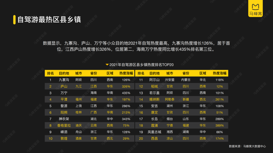 據馬蜂窩旅游發布的數據顯示,2021年1-7月自駕游熱度明顯超過去年同期;九寨溝、廬山、萬寧等小眾目的地自駕熱度最高,九寨溝熱度同比增長126%,居于首位、江西廬山熱度同比增長326%,位居第二、海南萬寧熱度同比增長435%,位居第三。