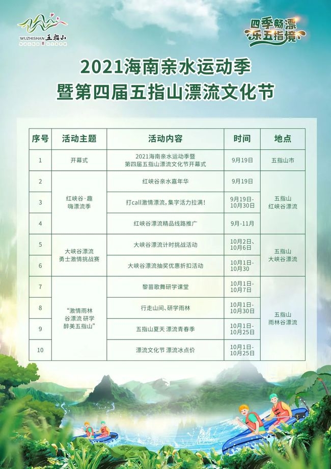 2021海南親水運動季暨第四屆五指山漂流文化節活動列表。