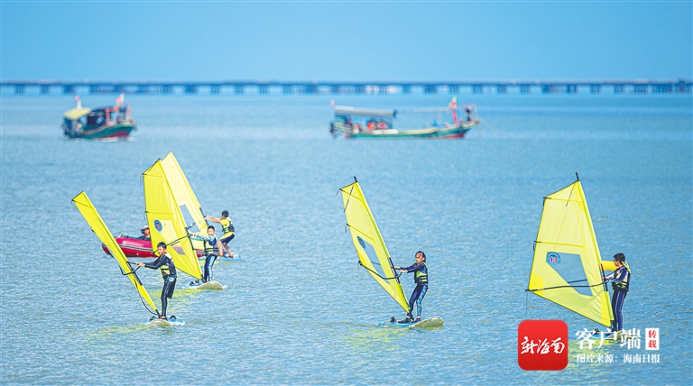 10月3日,由省旅文廳主辦的“中國體育彩票杯”2021年海南省帆船帆板公開賽在海口西秀海灘帆船帆板訓練基地舉行,來自我省各地的200余名群眾參加帆船和帆板比賽。圖為學生參加帆板比賽。海南日報記者 袁琛 攝