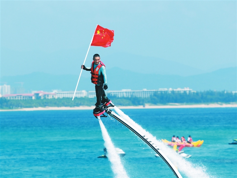 10月1日,三亞蜈支洲島旅游區(qū)水上飛龍表演。 三亞日報記者 陳聰聰 攝