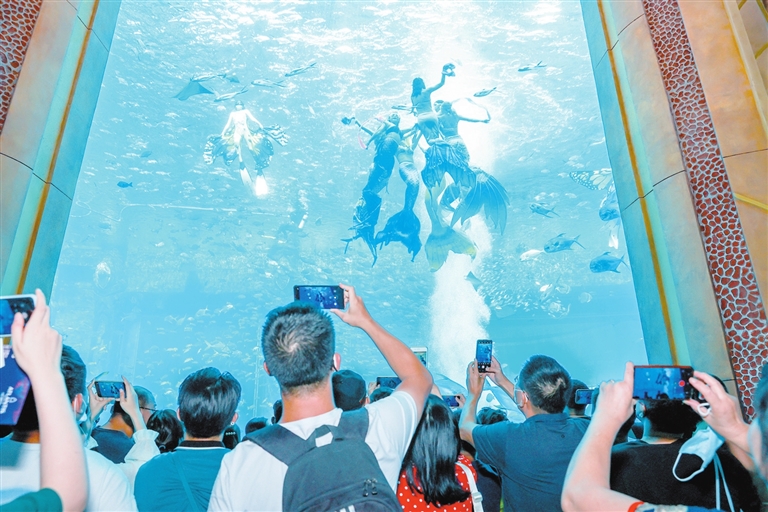 10月3日,游客在三亞·亞特蘭蒂斯失落的空間水族館觀看美人魚表演并用手機(jī)記錄精彩瞬間。 三亞日報記者 陳聰聰 攝
