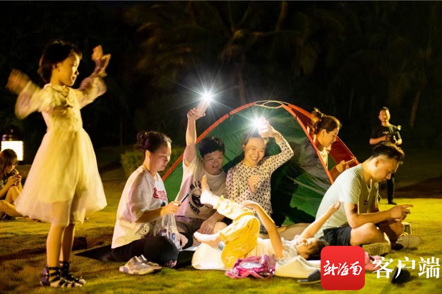 “星空部落野營(yíng)”吸引了不少游客參與,他們?cè)诤_叢莸鼗蛏碁┞稜I(yíng),燃起篝火,聆聽鄉(xiāng)村音樂,體驗(yàn)不一樣的樂趣。