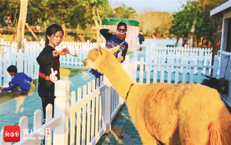 小朋友在定安縣香草田園共享農莊喂羊駝。海南日報記者 張茂 攝