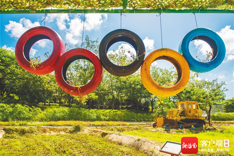 三亞鴻洲共享農莊用廢舊輪胎改造成的景觀。海南日報記者 袁琛 攝