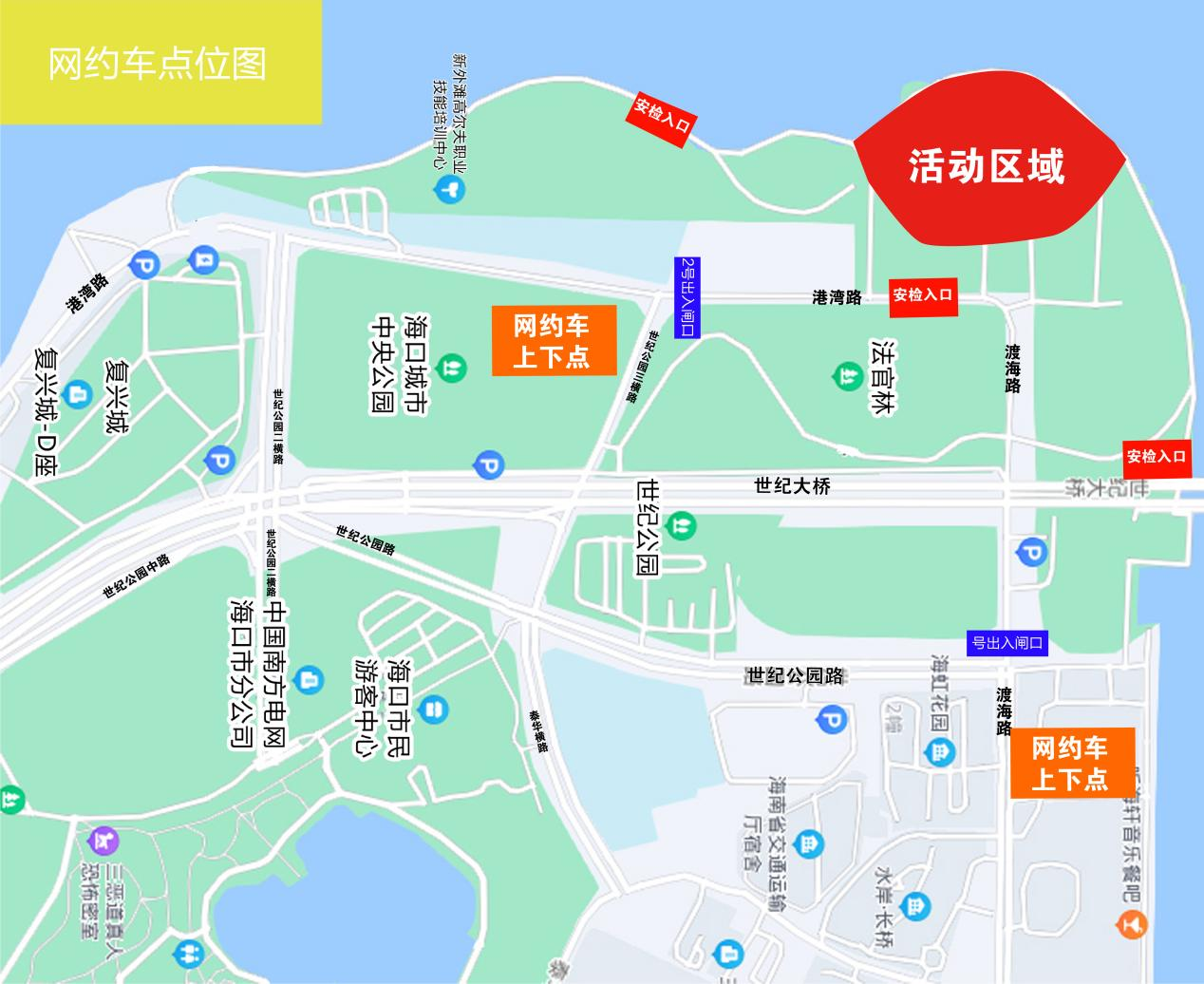 落客區(qū)2:世紀大橋--世紀公園二橫路(左轉)--港灣路--世紀公園三橫路(路邊上下車點)