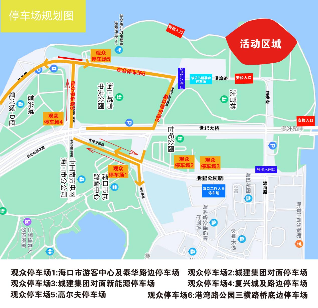 觀眾停車區(qū)域4、5、6:世紀大橋--世紀公園二橫路(左轉)--復興城及路邊、高爾夫、港灣路及公園三橫路停車場