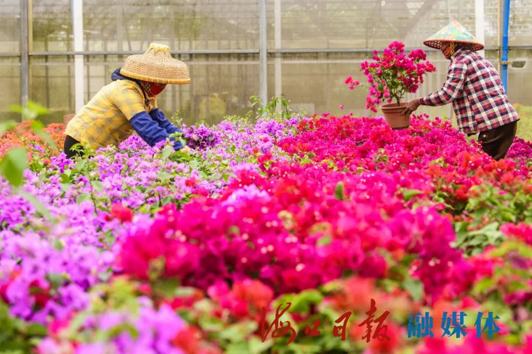 12月19日下午,在海口三角梅共享農(nóng)莊的花棚里,來(lái)自附近鄉(xiāng)村的花農(nóng)正在照料花卉盆栽。