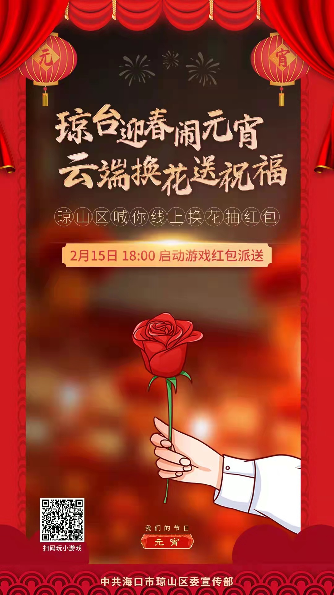 府城元宵換花節是民間自發形成的傳統民俗活動,歷年都會吸引大批游人來到府城地區賞花燈、換花、鬧元宵。在當前新冠肺炎疫情防控工作依然不能松懈的情況下,瓊山區將在元宵節當天推出線上換花搶紅包小游戲、瓊山文化過大年之網上來換花等線上活動,將線下的換花民俗傳向“云端”,引導廣大市民游客線下不聚集、線上賞民俗,歡樂鬧元宵,營造濃厚的節慶氛圍。