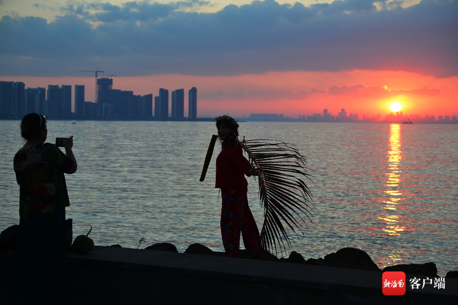 25日,海口灣,游客拿椰樹葉子當道具拍照。記者 陳衛東攝