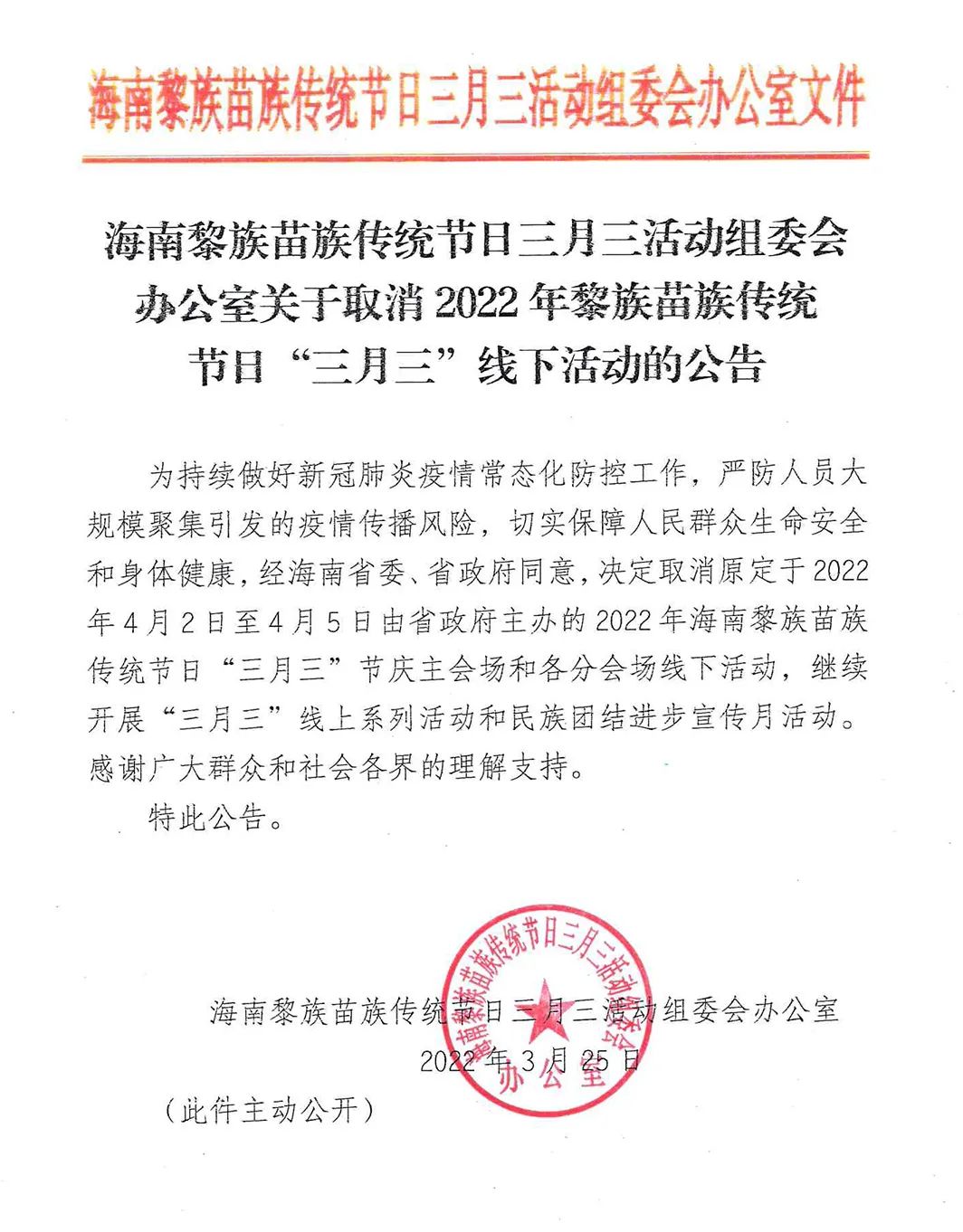 公告中提到,為持續做好新冠肺炎疫情常態化防控工作,嚴防人員大規模聚集引發的疫情傳播風險,切實保障人民群眾生命安全和身體健康,經海南省委、省政府同意,決定取消原定于2022年4月2日至4月5日由省政府主辦的2022年海南黎族苗族傳統節日“三月三”節慶主會場和各分會場線下活動,繼續開展“三月三”線上系列活動和民族團結進步宣傳月活動。