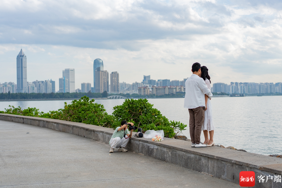 ??跒彻珗@一角,攝影師為一對剛領結婚證的新婚夫婦拍照留念。
