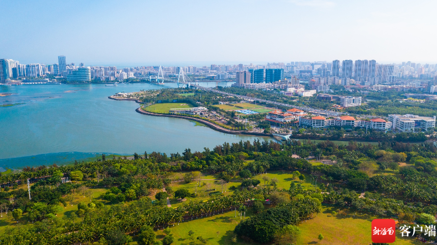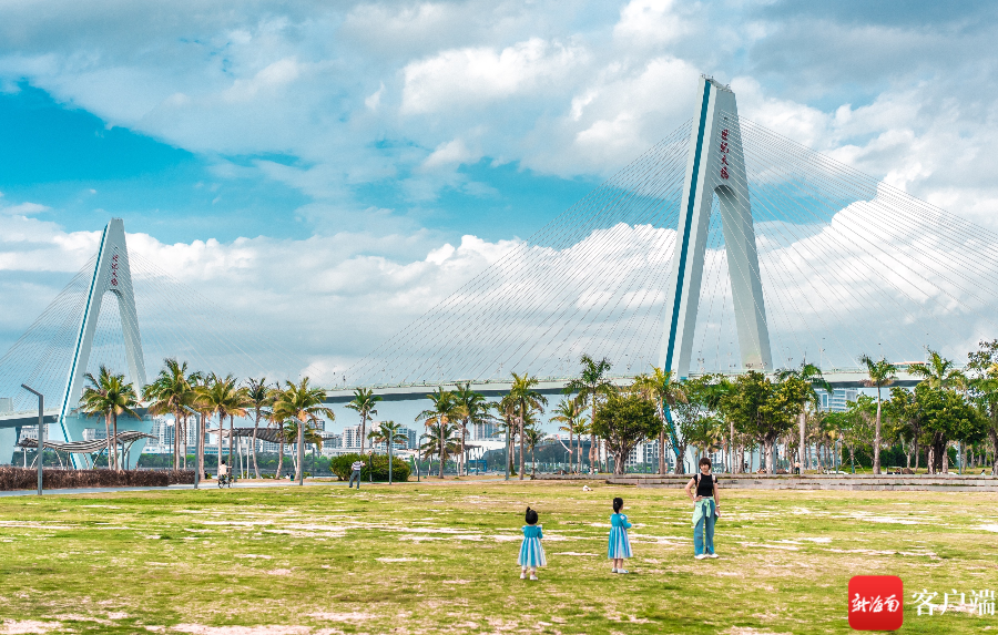初春的海口灣, 椰樹與世紀大橋相互映襯,別有一番椰城韻味。