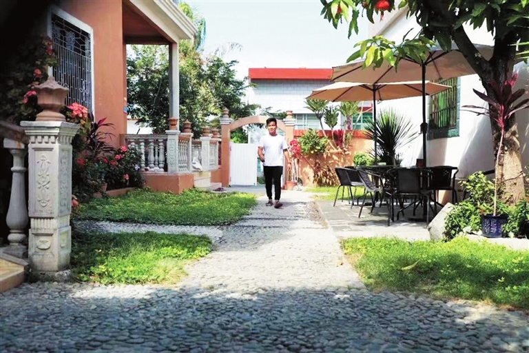 ?黎小康漫步在自家民宿庭院。