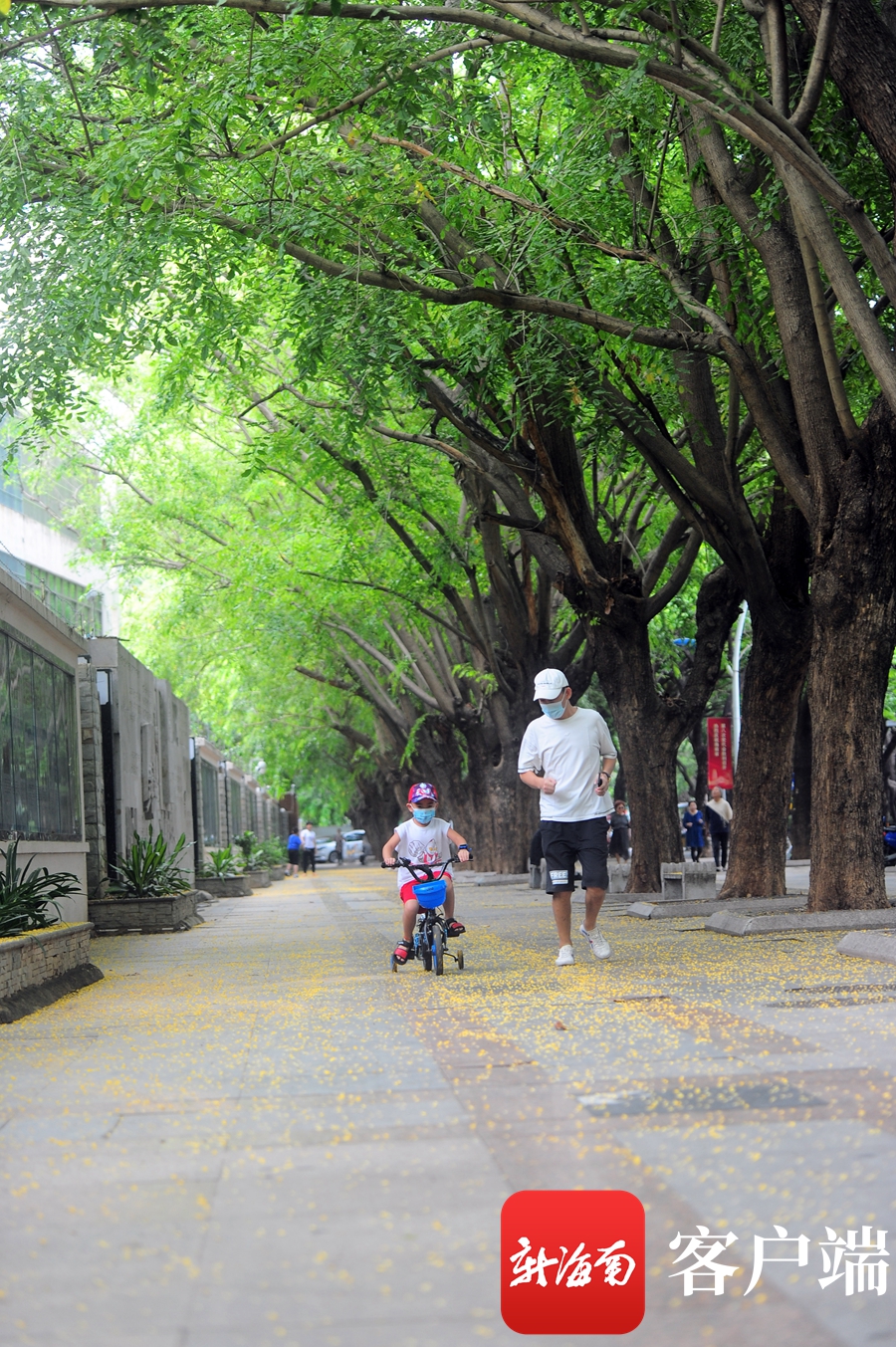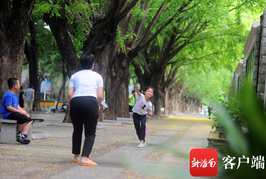 5月4日,市民和孩子在三亞市河?xùn)|路紫檀樹下玩耍。記者沙曉峰攝