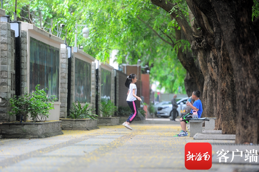 5月4日,孩子們在三亞市河?xùn)|路紫檀樹下玩耍。記者沙曉峰攝