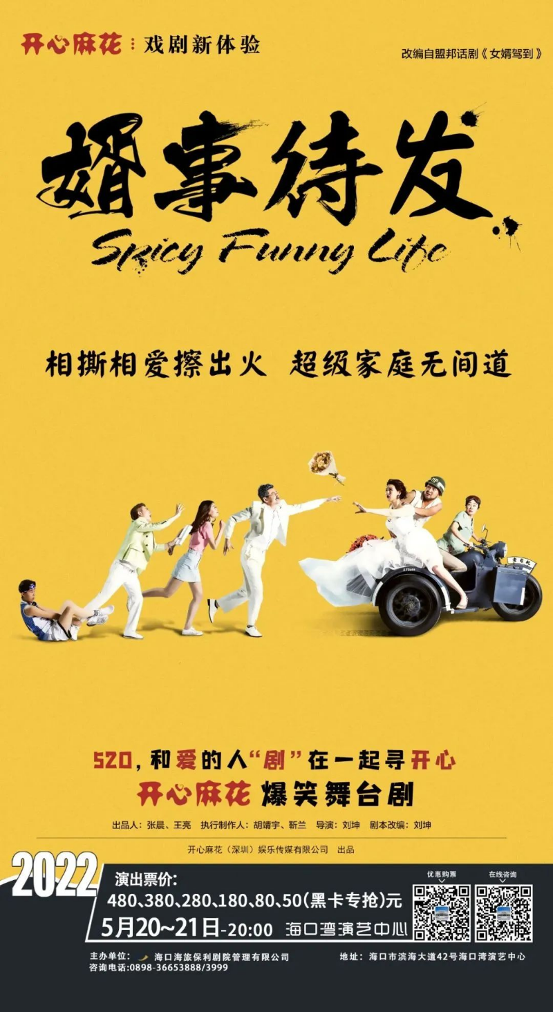 5月20日晚,海口灣演藝中心將上演開心麻花戲劇新體驗《婿事待發(fā)》;“花墻 Fancy wall2022全國巡演”海口站演出將于5月28日舉行;5月21日,“夏日沖浪手”海口站也同步在海口OLD SCHOOL舉行。