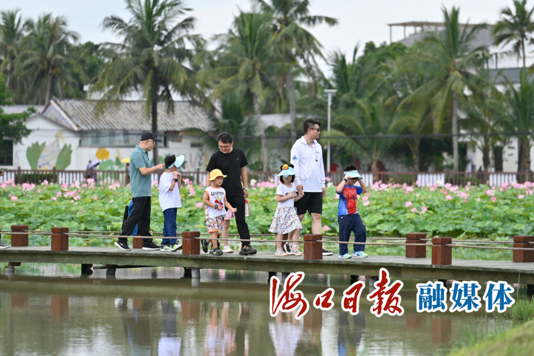 5月21日正值小滿節氣,趁著天氣晴好,市民謝杞沫帶著孩子來到演豐鎮的海口芳園國際藝術村賞荷花、逛特色民居。