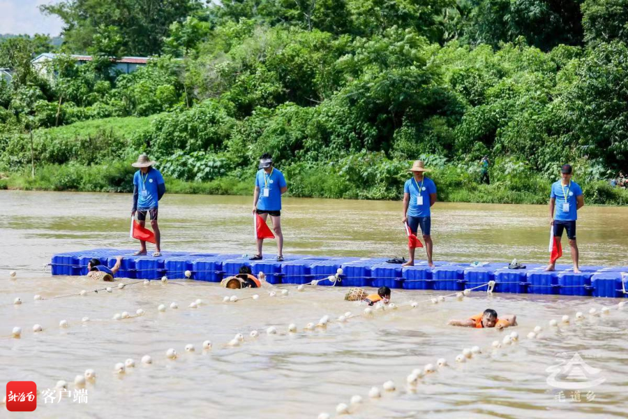 新海南客戶端、南海網(wǎng)、南國(guó)都市報(bào)記者從五指山市毛道鄉(xiāng)政府相關(guān)負(fù)責(zé)人處了解到,今年端午節(jié),毛道鄉(xiāng)在以往民宿活動(dòng)的基礎(chǔ)上創(chuàng)新活動(dòng)形式,新推出的“葫蘆渡水”競(jìng)技比賽活動(dòng),吸引了不少市民游客關(guān)注。活動(dòng)現(xiàn)場(chǎng),當(dāng)?shù)氐睦枳迥凶佑煤J這種原始的水上交通工具,進(jìn)行渡水競(jìng)技比賽,吸引了不少觀眾駐足觀看。