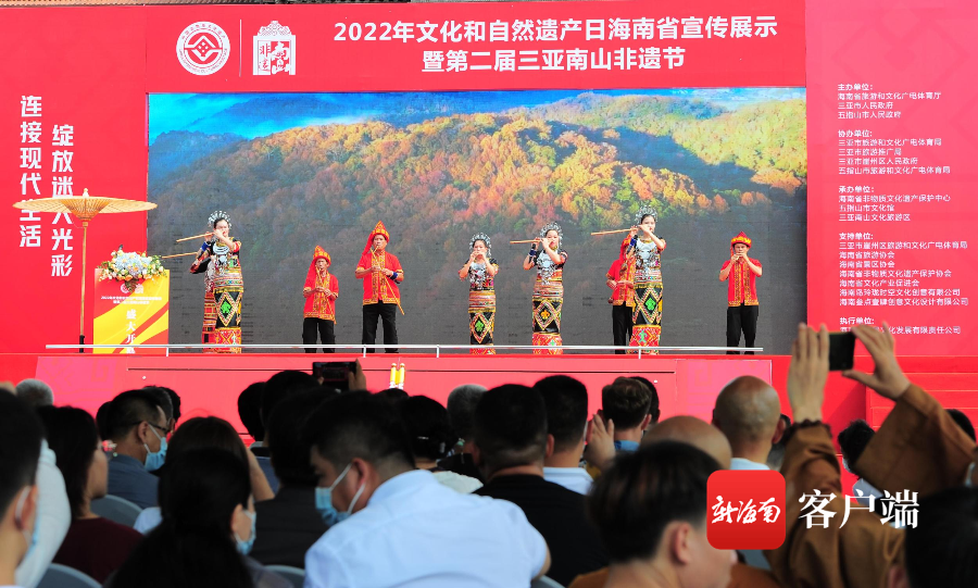 2022年文化和自然遺產日海南省宣傳展示暨第二屆三亞南山非遺節由海南省旅游和文化廣電體育廳、三亞市人民政府、五指山市人民政府聯合主辦,三亞市旅游和文化廣電體育局、三亞市旅游推廣局、三亞市崖州區人民政府、五指山市旅游和文化廣電體育局協辦,海南省非物質文化遺產保護中心、五指山市文化館、三亞南山文化旅游區共同承辦。
