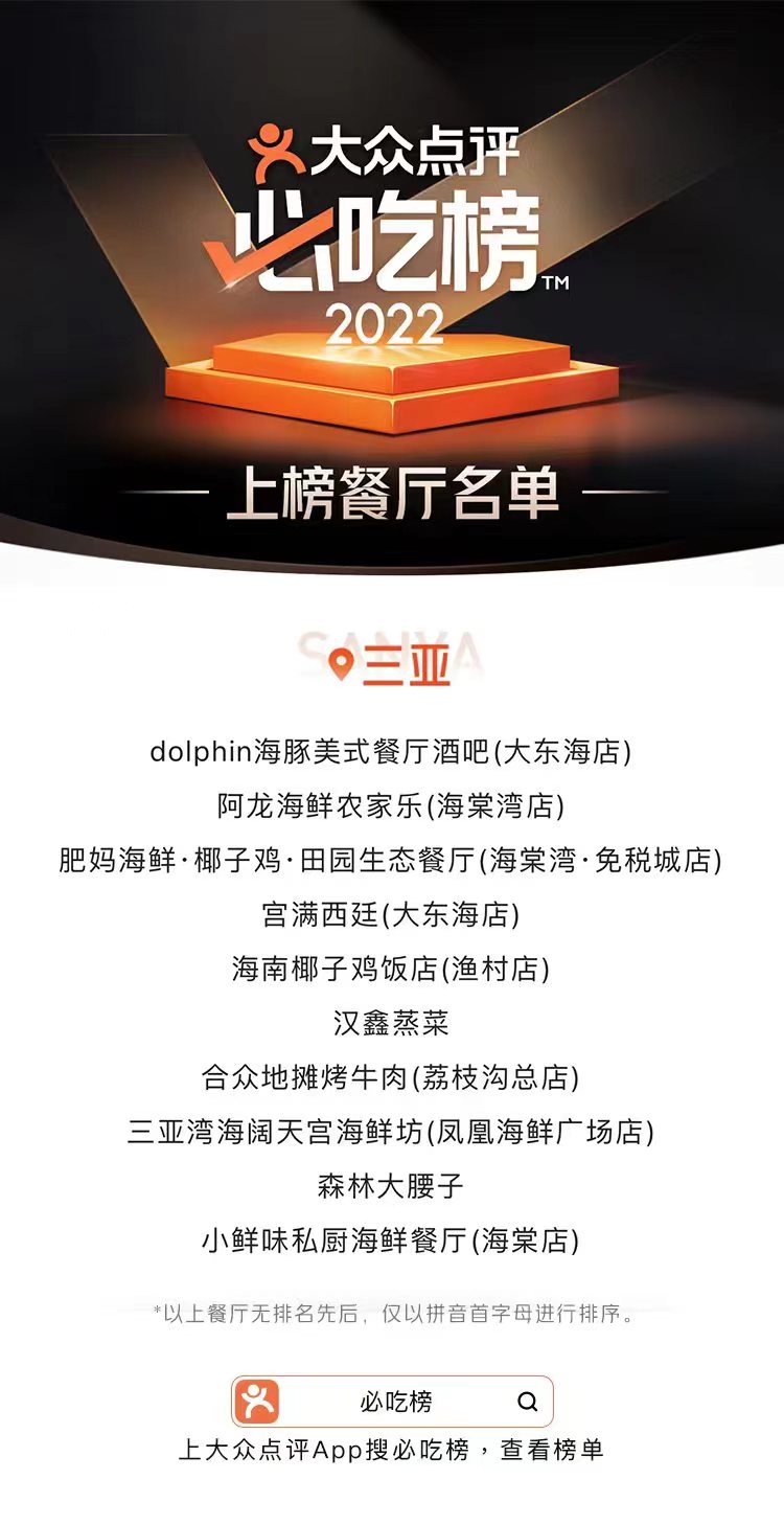 此外,本次“必吃榜”三亞共有3家海鮮餐廳上榜,分別是小鮮味私廚海鮮餐廳(海棠店)、三亞灣海闊天宮海鮮坊(鳳凰海鮮廣場店)、阿龍海鮮農家樂(海棠灣店)。這3家均是收錄3年以上的口碑餐廳,給食客們提供了品嘗海鮮的好去處。