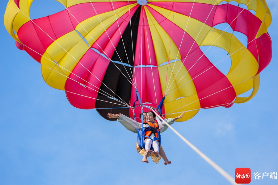 游客在三亞蜈支洲島旅游區體驗彩虹拖傘。武昊 攝