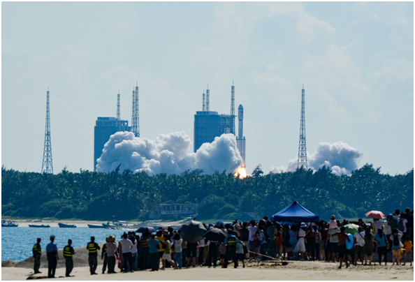 ↑游客在文昌市觀看火箭發射。新華社記者 周佳誼 攝